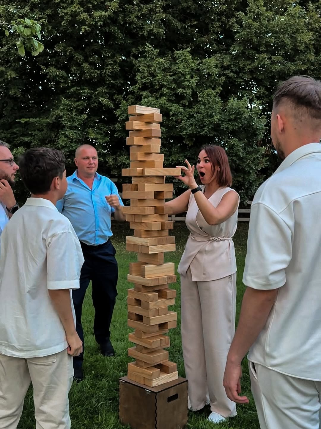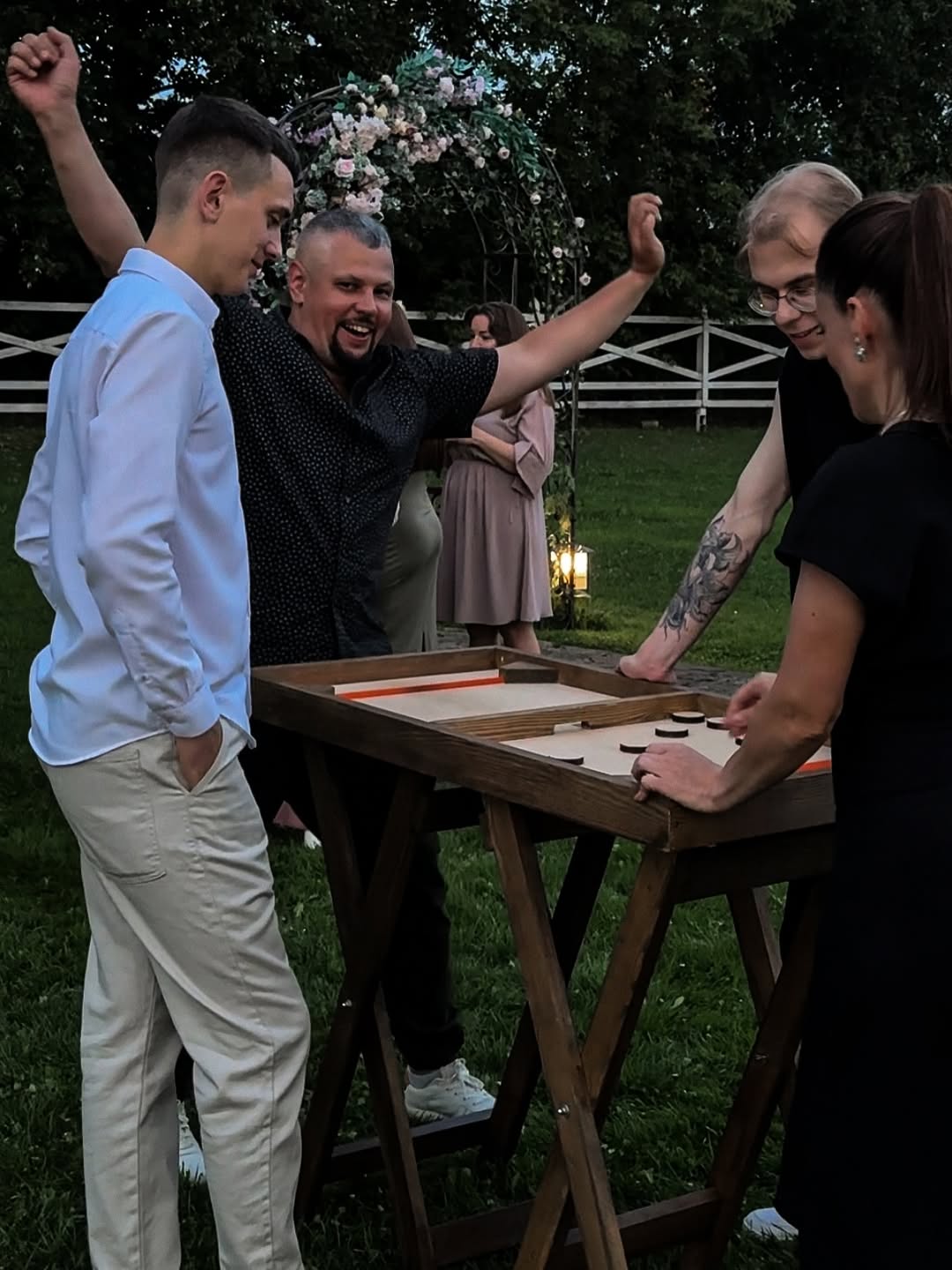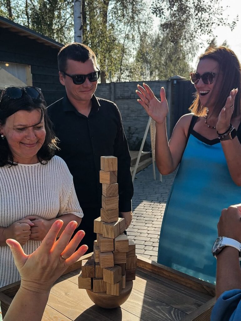 Мы привозим игры, в которые невозможно не втянуться. Не надо собирать команду, не надо ждать указаний — люди сами подходят, сами начинают, сами не могут остановиться. Это работает без тамады, сценария, или плана. Просто стоят деревянные игры, и вокруг них уже жизнь.